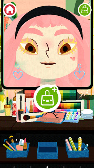 角色互动自然有趣,做完造型会开心转圈、比出剪刀手,甚至撒娇讨要更多装饰。想上妆只需轻点桌面彩妆盘,打开眼影格,蘸取颜色,直接在脸上描绘即可。
