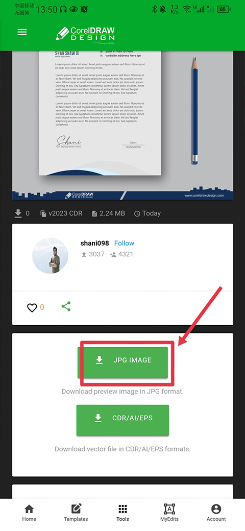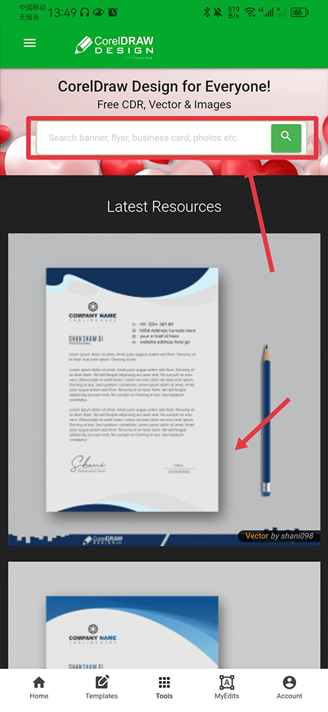 打开CDR看图软件手机版后,在首页搜索栏输入关键词或浏览分类进入目标作品页面