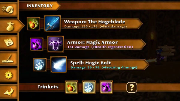 装备系统分为武器、护甲与法术三大类,其下延伸出元素附魔机制。焰之元素提升输出并使护甲附带溅射伤害;霜之元素令命中目标短暂减速,护甲附魔后亦可波及周边;魔之元素作用隐晦却实用,当附魔于护甲时,会在战斗中缓慢恢复生命。
