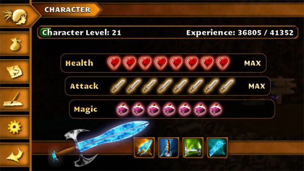 人物属性界面直观呈现当前状态:顶部三栏分别显示最大生命值、基础攻击力与最大法力值。下方四格为空置位置,对应传说之剑的碎片,需在冒险后期逐一寻获并归位。