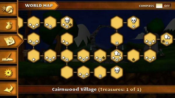 地图界面以图标传递关键信息:骷髅标记代表区域Boss战点,房屋图标指示村庄所在,含旅馆休整与物资补给功能;拱门符号为传送节点,支持跨区域快速移动;星号则实时反馈该地图宝箱收集完成度。