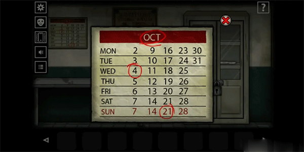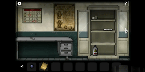 角色苏醒后离开房间,前往第四个房间(医务室),注意墙上日历标注的“OCT”代表十月,由此推断密码为「10421」。输入密码后打开下方抽屉,取得「一串钥匙」。