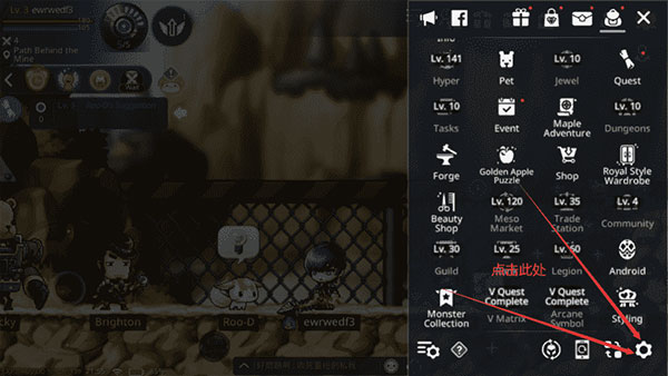 打开冒险岛M国际服,进入游戏主界面后点击右上角的“三”图标(位于感叹号覆盖区域)。