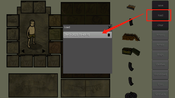 若需调用已保存的搭配,点击“load”并选择对应存档,即可快速还原角色造型。