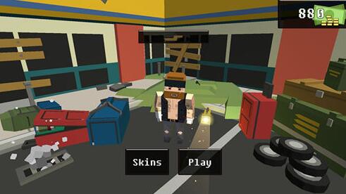Skins为角色商城,可用游戏内货币购买新形象;Play按钮用于开始游戏,右上角显示当前持有金额。