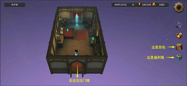 初次进入游戏后,你会出现在自己的房间内。此处可休息恢复体力,也能将背包物品存入储物箱。点击右侧背包按钮可查看角色信息与物品清单,获得新装备或习得技能后记得及时穿戴使用。