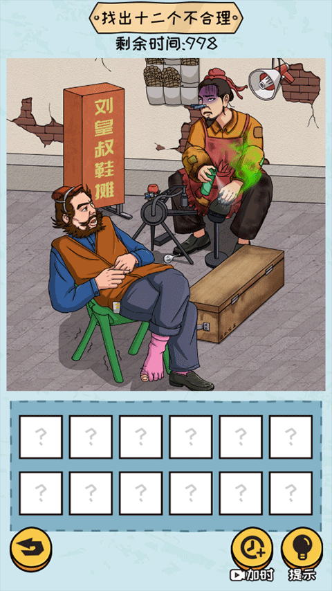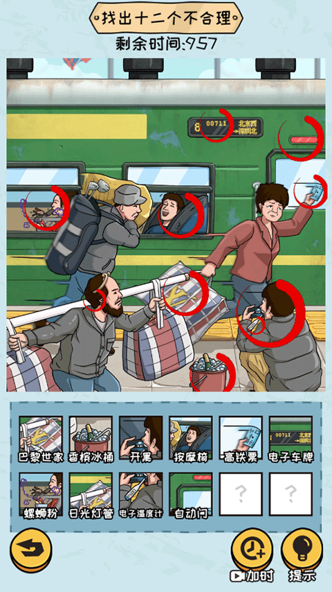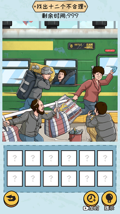 每关需找出十二处异常点,注意时间限制,误点还会导致倒计时缩短,务必谨慎判断。