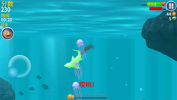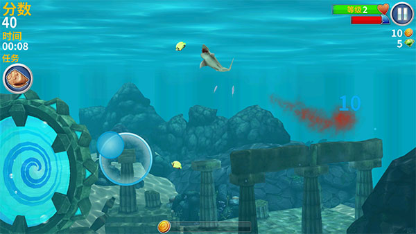使用虚拟摇杆控制鲨鱼移动,吞噬沿途的小型鱼类。