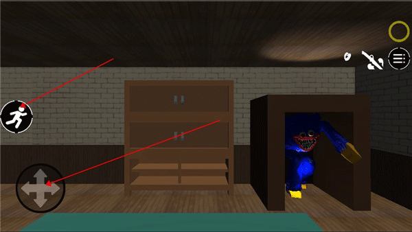 通过右侧虚拟按键控制角色移动,支持行走、站立与蹲下等动作操作。