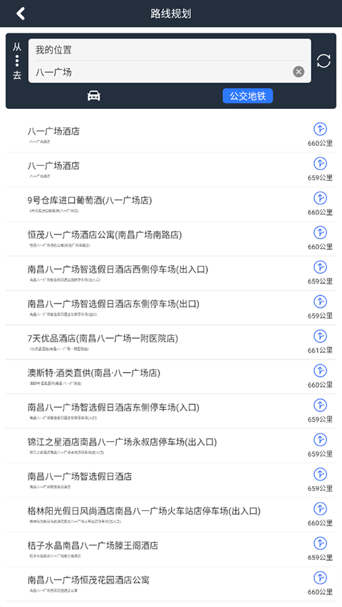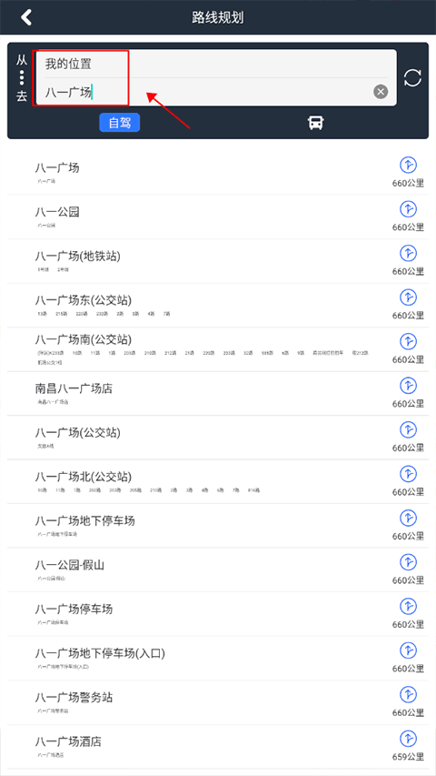 依次输入出发地与目的地,从候选地址中确认具体位置后即可开始导航指引。