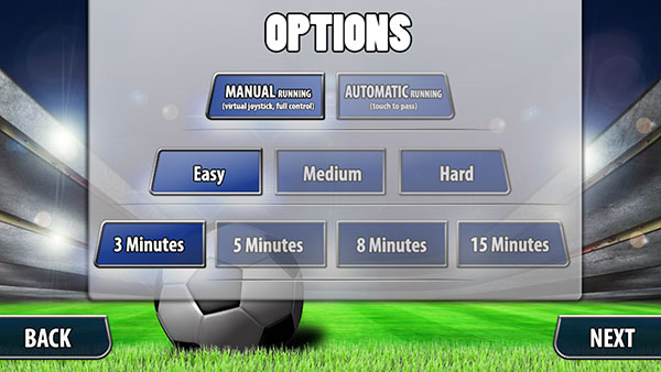 选定球队后进入“options”设置界面,可调整自动或手动奔跑方式、比赛难度及时长