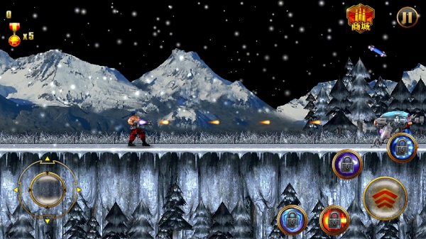 冰原战场登场,新增高速机枪兵与趴地射击敌人,地面不时抛出炸弹。行至三段断崖前,耐心等待空中飞来的“S”、“R”与“神鹰”道具全部击落。“神鹰”可有效清除水面伏兵。后续两段平路各有一辆重型坦克,需退至屏幕最左端持续射击,待其发红冲来时保持火力将其击毁。最终面对空中平台BOSS。