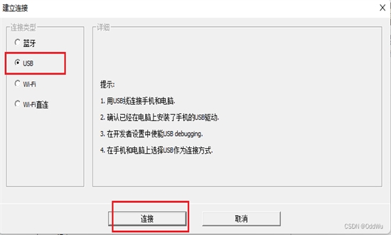 启动客户端后,选择对应的连接模式,系统会自动识别已连接的设备。