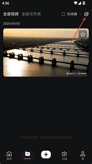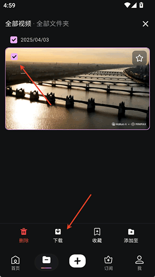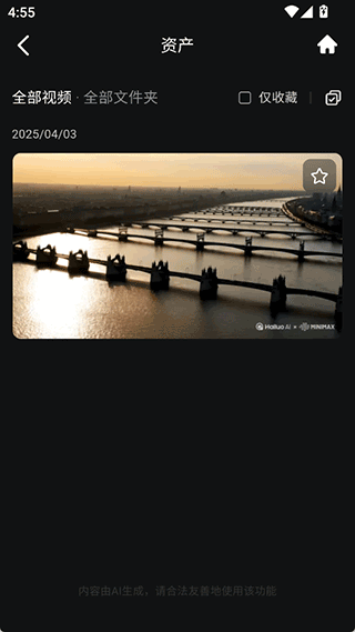 用户可在“资产”页面找到已生成的视频,点击右上角勾选按钮进行选择。