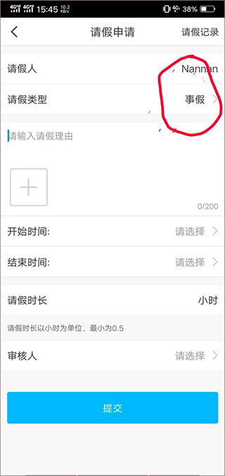 依次填写请假人、请假类型(如事假、病假等)、请假理由、起止时间等信息,确认无误后点击提交。