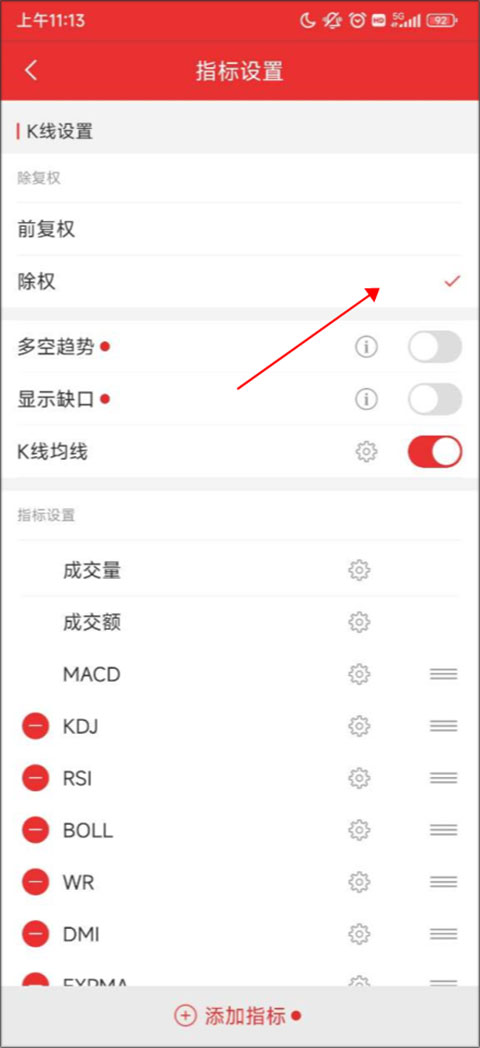 进入设置页面后,点击“除权”选项,右侧出现勾选标记即表示已启用。