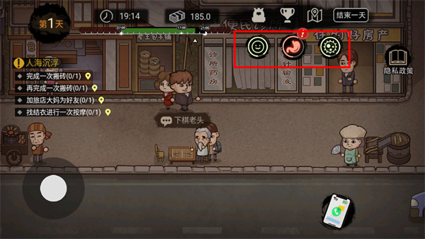 右上角实时反映角色的身体状况,包括饥饿、疲劳与情绪,直接影响行动能力;