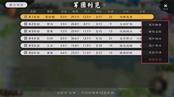 在军团列表中可进行更换都督、修改军团名称、增减所属城池等操作;