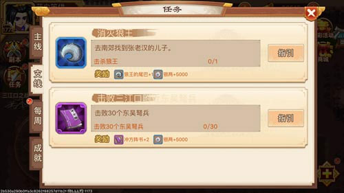 支线任务目前共16项,奖励包括银币、狼尾巴、策魂、蓝紫装备、丹药、阵法书等。
