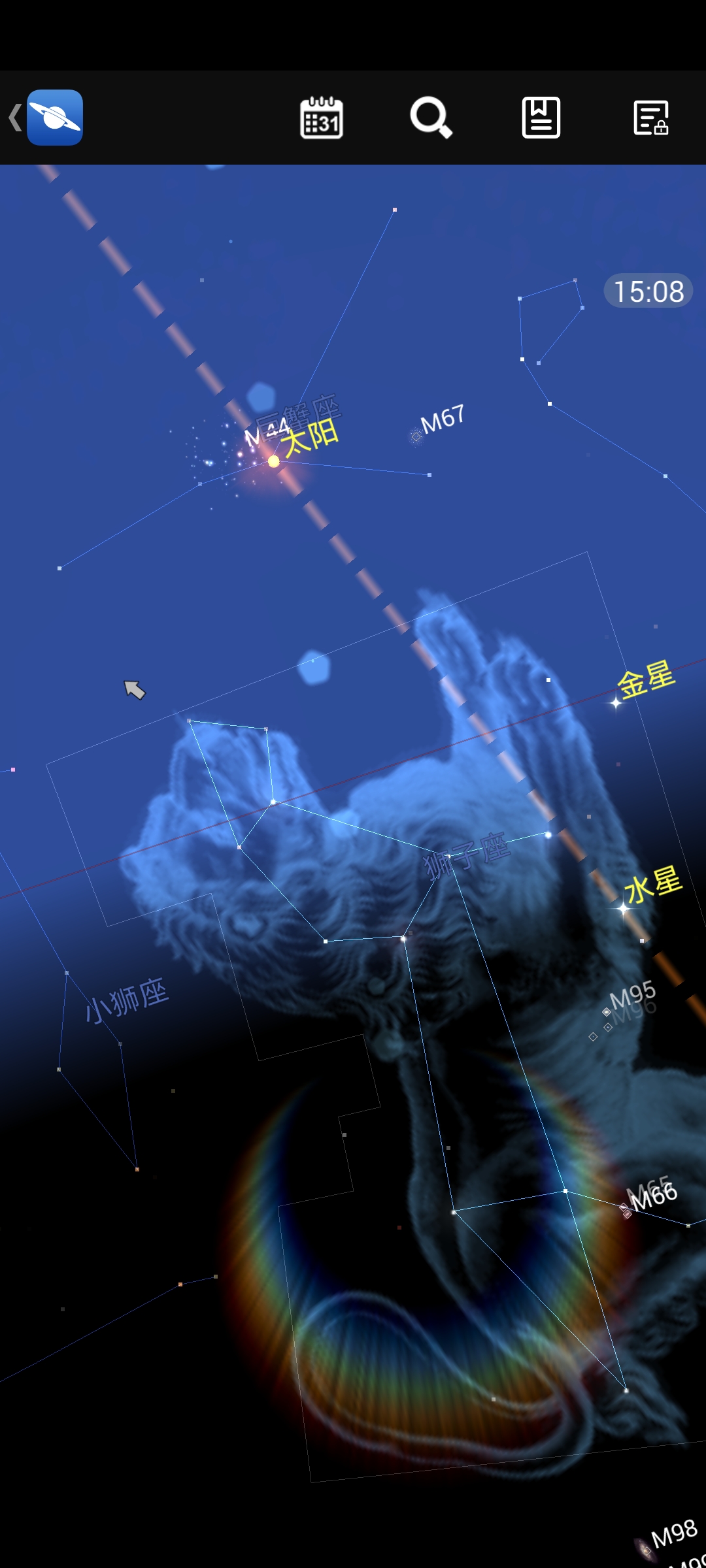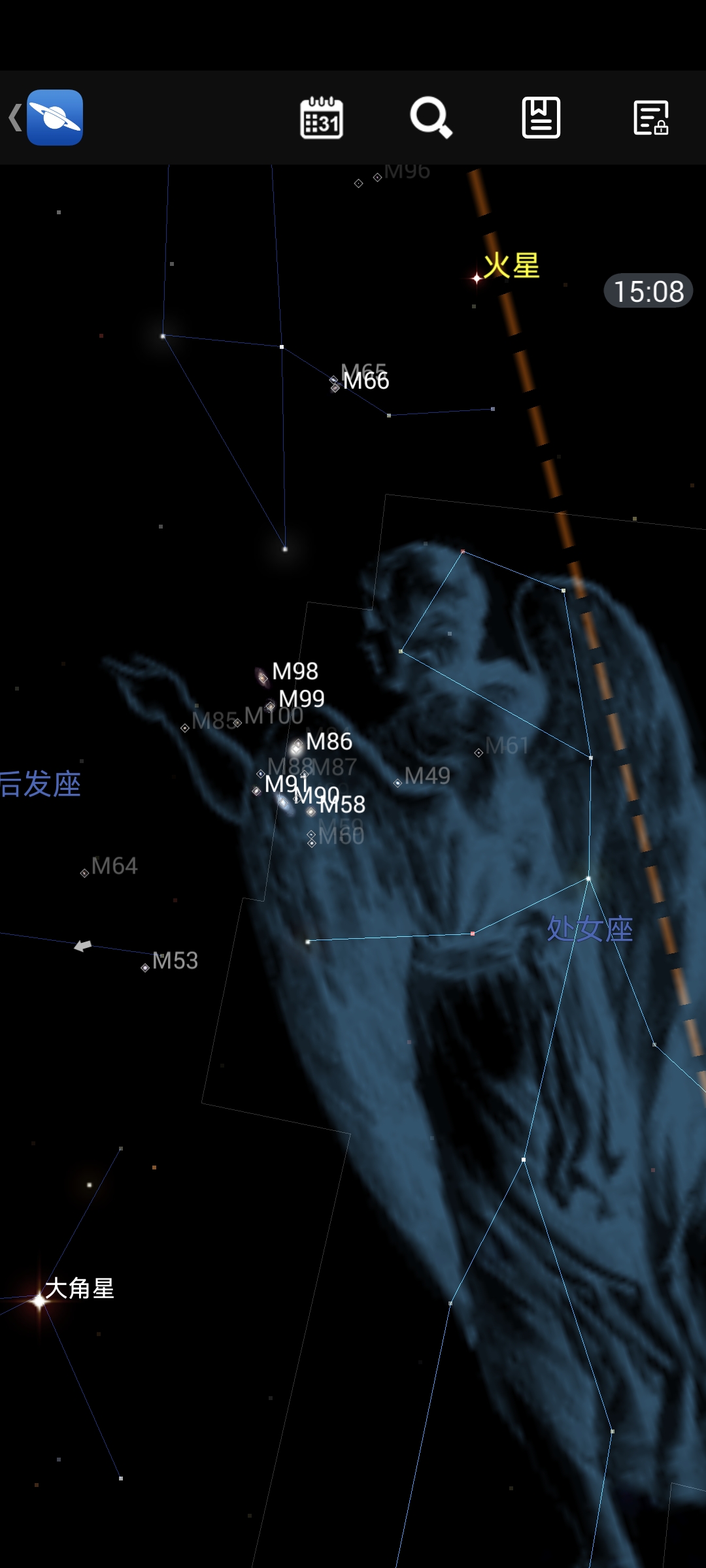 点击左上角菜单图标,可切换显示太阳系天体、恒星、星座或梅西耶天体等内容,还可调整显示模式。