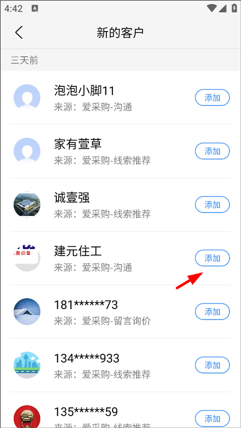 此外,消息页面右上角的“通讯录”功能可查看平台推送的新客户线索,包括推荐买家与留言询价信息,点击“添加”即可将其纳入联系人列表,便于后续跟进。