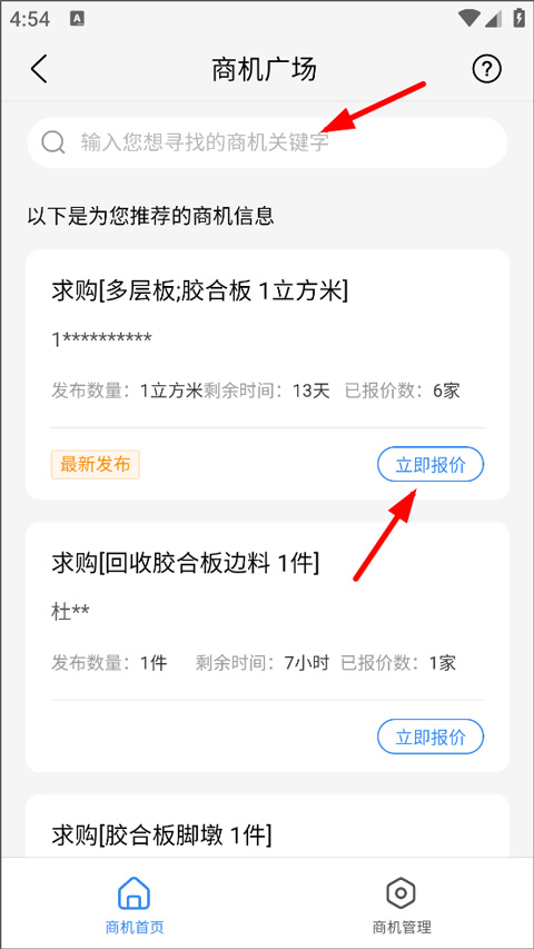 在“询价线索”中可查看买家留言数量并主动联系;“商机广场”支持关键词搜索或浏览系统推荐的采购需求,会员每日享有三次报价机会。