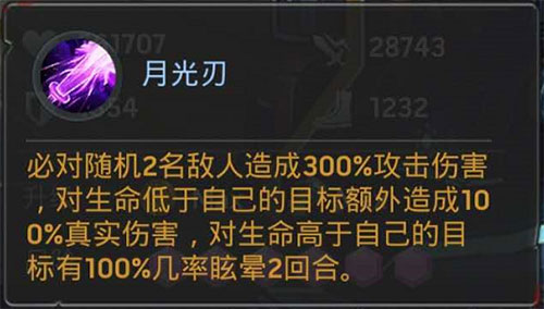 一技能可对随机两名敌人造成巨额伤害,若目标血量低于自身则附加100%真实伤害,高于自身则施加100%眩晕效果,兼具压制与收割能力。