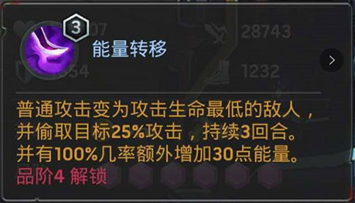 三技能强化普攻,优先锁定血量最低敌人并偷取其15%攻击力。