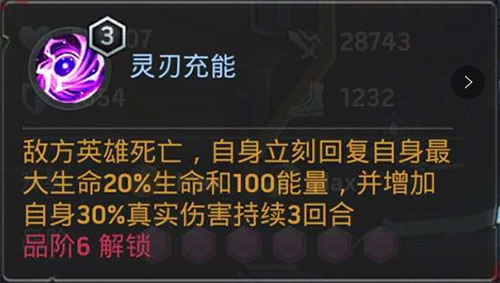 四技能在敌方英雄阵亡时,立即回复艾莉亚100点能量并提升30%真实伤害,显著加快技能循环节奏,强化持续作战能力。