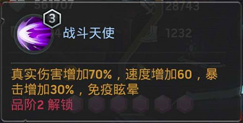 二技能提供70%真实伤害加成,同步提升速度与暴击率,并附带免疫眩晕效果,全面增强生存与输出稳定性。