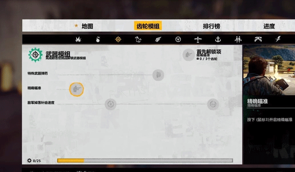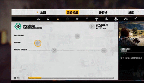 找到“精准瞄准”功能并进行升级,此操作需消耗三个齿轮资源方可完成。