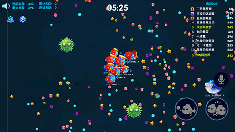 除方向控制外,游戏设有吐球与分裂两个核心操作。吐球可向指定方向发射能量球,虽会损失部分自身体型,但该能量球可供其他小鱼吸收。实战中可用于快速聚合分裂后的分身、推动海胆规避风险,甚至诱导对手撞上海胆造成伤害。