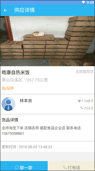 3、浏览所需食品信息,支持直接与商家“聊一聊”或一键拨打电话沟通详情。