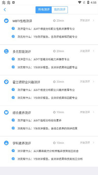 点击“做测评”可对学科倾向、性格特质、职业兴趣及综合素养进行多维度评估;