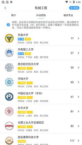 例如选择机械工程专业,系统将展示所有开设该专业的高等院校名单;