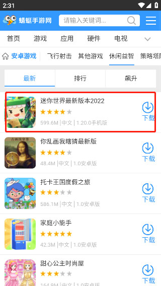 以《迷你世界》为例,点击对应条目进入详情页,页面展示版本信息、更新日志与用户评分。