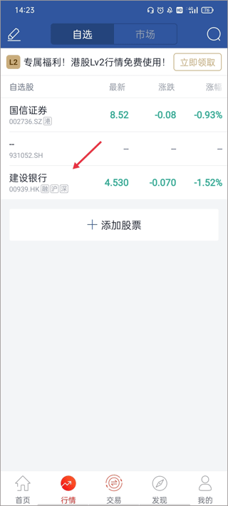 注册并登录后,进入【行情】页面,点击底部“添加股票”按钮。