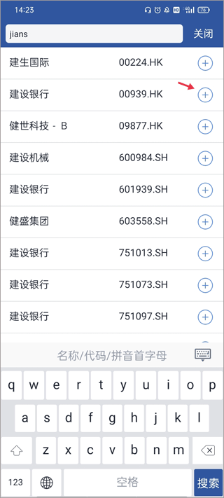 以建设银行为例,在搜索框中输入名称,找到目标股票后点击右侧“+”号完成添加。