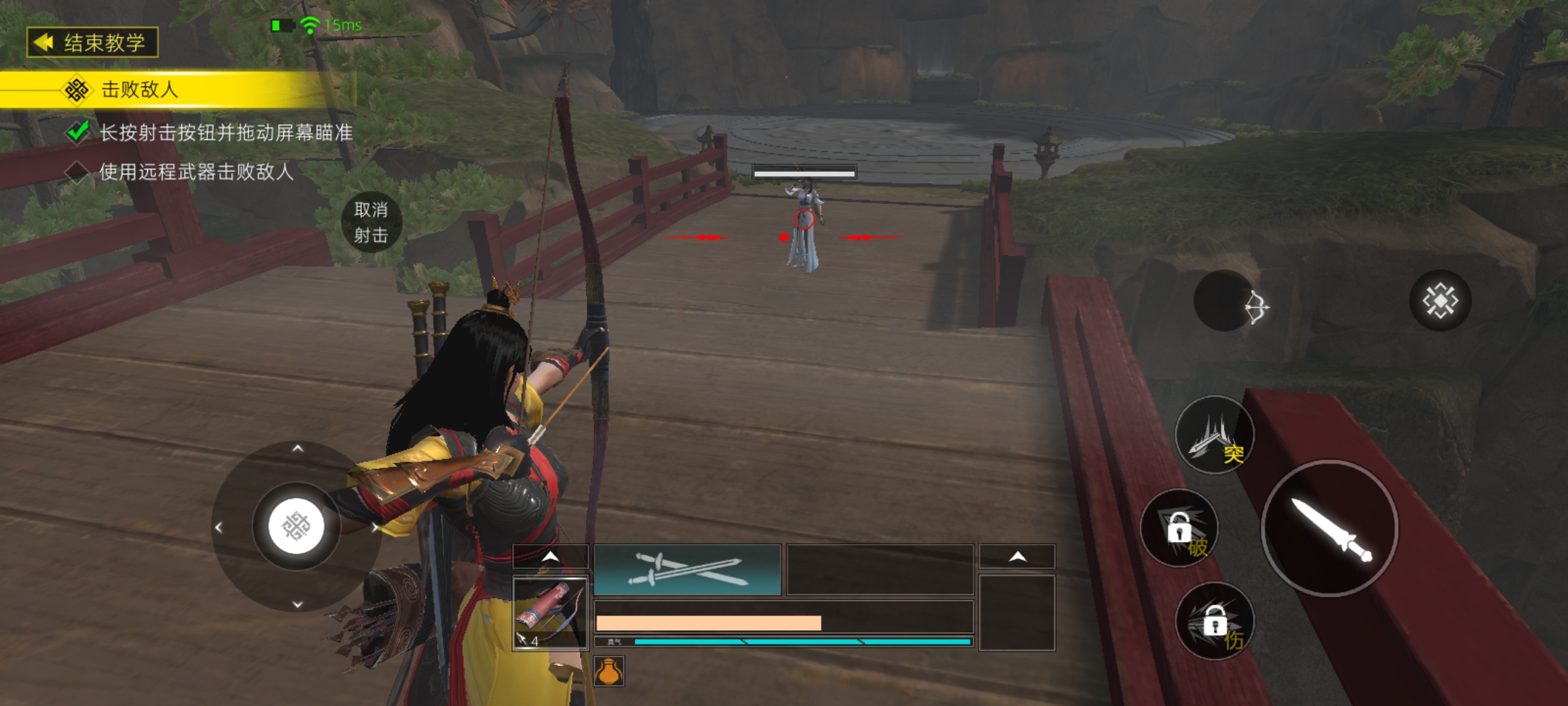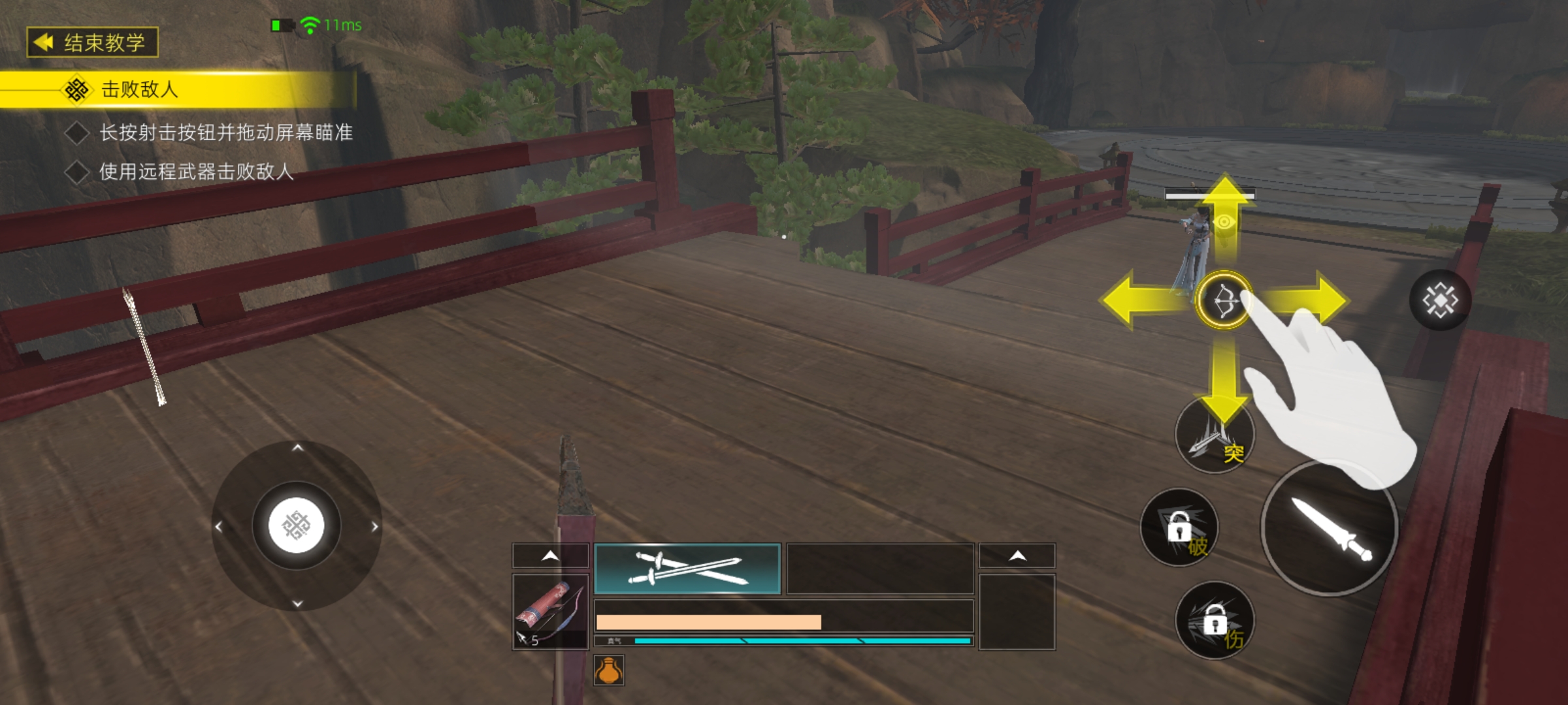 使用远程武器时,长按射击键并滑动屏幕调整瞄准方向,精准锁定目标。