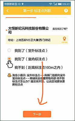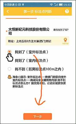 若在现实中找到对应门店,选择找到了(区分室内与室外),继续下一步;若未找到,则选择找不到并提交。页面中箭头指示操作方向。