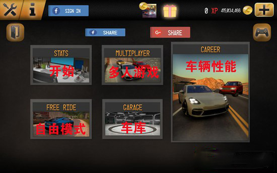 启动游戏后,主界面会呈现多个功能选项,包括开始游戏、多人游戏、自由模式、车库以及车辆性能设置等。