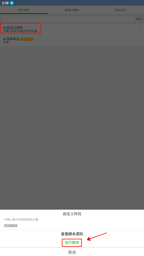 在自动化界面中,选择“自定义改机”,随后在弹出窗口中点击“运行脚本”。