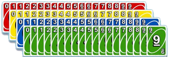 UNO卡组共108张,涵盖红、黄、蓝、绿四色,分为数字牌、功能牌与万能牌三类。