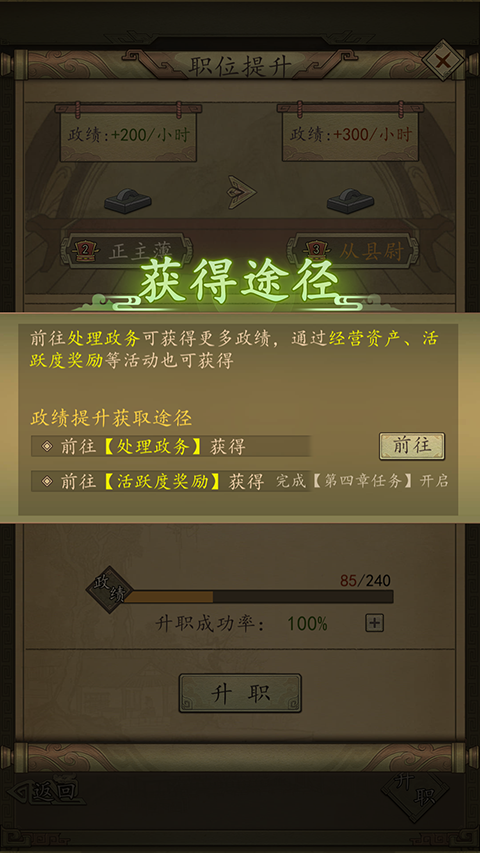 - 自然增长:随时间自动积累,增长速率与当前官职等级挂钩。