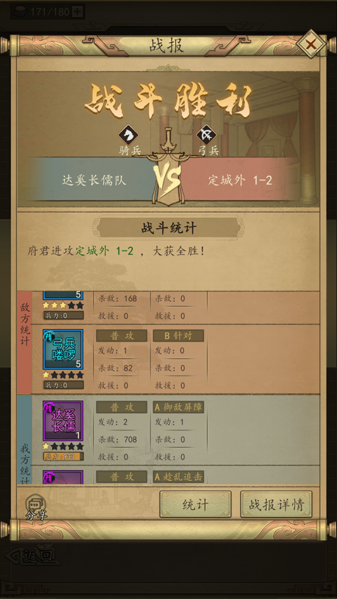 - 胜利后可通过战报查看详细战斗数据。