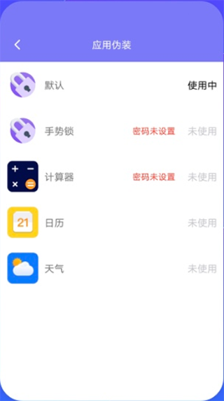 应用伪装,提供多种图标伪装选项,如计算器、日历、天气等,让隐藏空间外观毫无破绽。