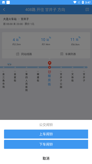 选定下车地点后,再次开启公交闹铃,到站时便会及时通知,再也不用担心错过站点。