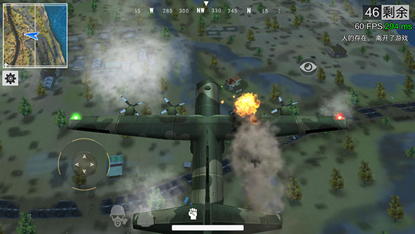 飞机飞行途中可点击左上角地图查看航线,当飞越岛屿中心区域时,点击屏幕中央跳伞按钮即可开始降落。