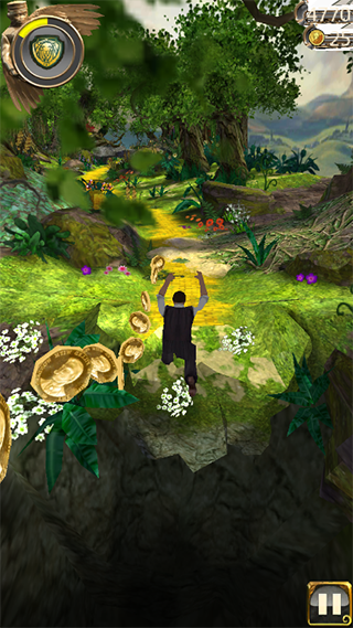 向上滑动实现跳跃,部分路段可借此跃上滑索快速前行;同时支持重力感应操作,倾斜设备即可微调角色位置,便于收集金币并应对狭窄路径。