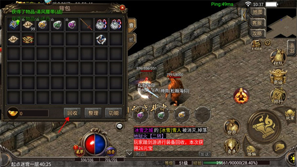点击背包内的“回收”按钮,同样能直接跳转至装备回收页面。